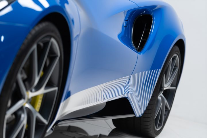 エクステリアでまず目を引くのは、スワンネック型のカーボンGTウィング。実際のレーシングカー同様、翼端を上から支える構造により、ダウンフォースの向上とビジュアルの迫力を両立しています。